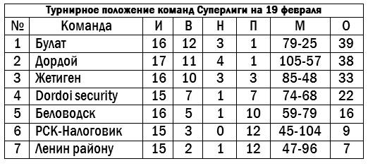 «Жетиген» набрал 33 очка и идет на третьем месте в Суперлиге. «Ленин району» замыкает турнирную таблицу, имея в активе всего 7 очков.