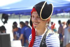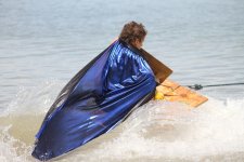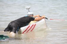 Соревновательную программу открыл «Золотой серфер», прокатившийся на своей доске не так уж и далеко от специально построенного пирса. Кстати, все плавательные средства запускались на воду и набирали скорость благодаря скуртеру, под управлением администратора городского парка кабельного вейкбординга «Onthewake» Ивана Кожевникова. Следующим на воду вышел участник под псевдонимом «Городской сумасшедший», его лодка-ванна, отделанная пенопластом, сразу же набрала воды и пошла ко дну – выступление было не столь удачным, что не скажешь о следующем участнике.