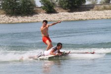 21 июня состоялись уже третьи по счету состязания под брендом «Гидролокация». На водную гладь «Ала-Арчинского» водохранилища свои плавательные средства вынесли более 15 участников, и каждое сооружение было высоко оценено как зрителями, так и организаторами шуточного турнира. У каждого стартующего было по две попытки. А если кто не успел изобрести свой плавательный аппарат, организаторы предложили совершенно бесплатно воспользоваться предметами из проката. Так что каждый желающий мог выбрать для себя тазик или снегоуборочную лопату по размеру. Перед стартом самого турнира свое мастерство продемонстрировал чемпион Кыргызстана по кабельному вейкбордингу Виталий Ботяйкин.