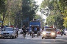 Велопробег стартовал с площади «Ала-Тоо», а маршрут его пролегал через бульвар Молодой Гвардии, улицу Московскую, бульвар Эркиндик. Финишировали велосипедисты на Старой площади.