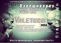 Как сообщают организаторы соревнований, - Федерация по боям без правил версии валетудо Кыргызстана, в них примут участие сильнейшие бойцы страны. Начало поединков, которые пройдут на центральном стадионе Сокулука - в 18.00.