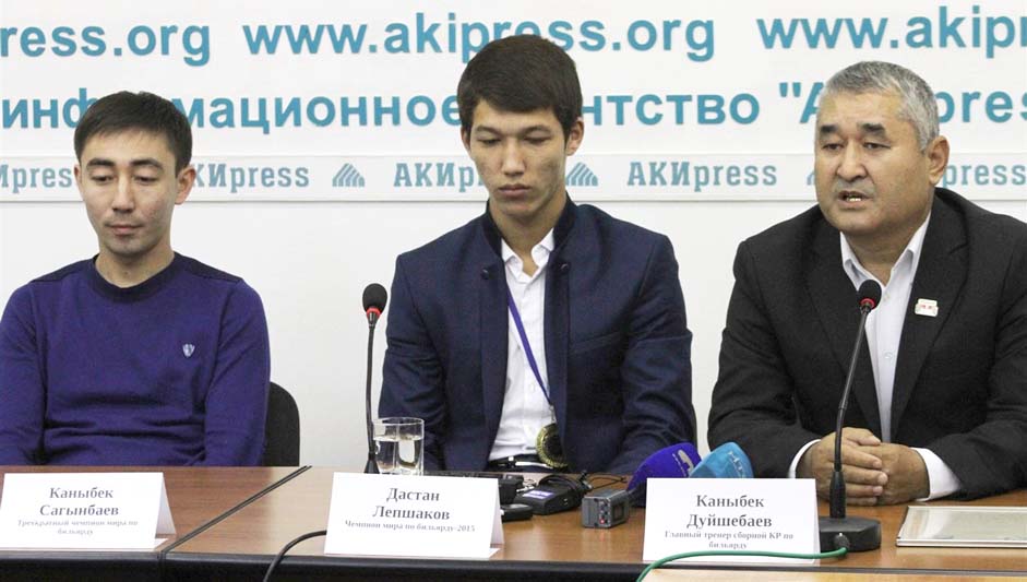 На встречу с журналистами новоиспеченный триумфатор мирового первенства пришел в сопровождении директора школы по бильярдному спорту Каныбека Сагынбаева (двукратного чемпиона мира) и главного тренера сборной Каныбека Дуйшебаева.