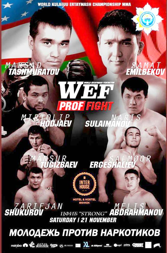 21 ноября в бишкекском Центре фитнеса и бокса STRONG пройдет крупный турнир по боям без правил по версии эр-таймаш WEF-PROFFIHGT Узбекистан - Кыргызстан.
