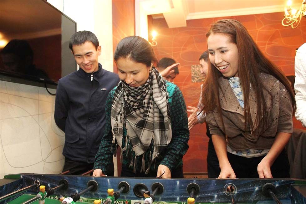 Затем журналисты приступили к турниру по настольному футболу. Конкуренция была высокой, ведь в состязаниях приняли участие и действующие чемпионы! Игры проходили по олимпийской системе - на вылет, до пяти голов. На игры в рамках отборочного раунда отводилось по 3 минуты. А в полуфинальных и финальных поединках пары играли по 5 минут. Дебютанты состязаний - команда информационного портала ru.sputnik.kg в составе Табылды Кадырбекова и Азамата Аралбаева блестяще провела все поединки и завоевала титул чемпионов.