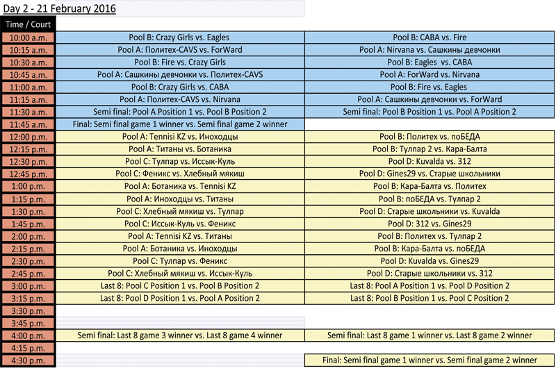 Как отмечает генеральный секретарь федерации баскетбола Тимур Талканбаев, в субботу 20 февраля, первыми на площадку выйдут юноши. Поединки в рамках данной возрастной группы будут проходить с 12.00 до 17.00. После окончания игр состоится награждение.