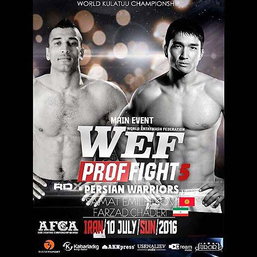 В главном поединке турнира WEF PROFFIGHT-5 «PERSIAN WARRIORS» встретятся Самат Эмильбеков (Кыргызстан) и Фарзад Джадери (Иран) - в весе 77 кг.