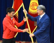 Президент пожелал спортсменам удачи и побед, и вручил государственный флаг Кыргызской Республики капитану сборной Арсену Эралиеву. По окончанию торжественного мероприятия состоялась церемония фотографирования Главы государства с членами спортивной делегации Кыргызской Республики.