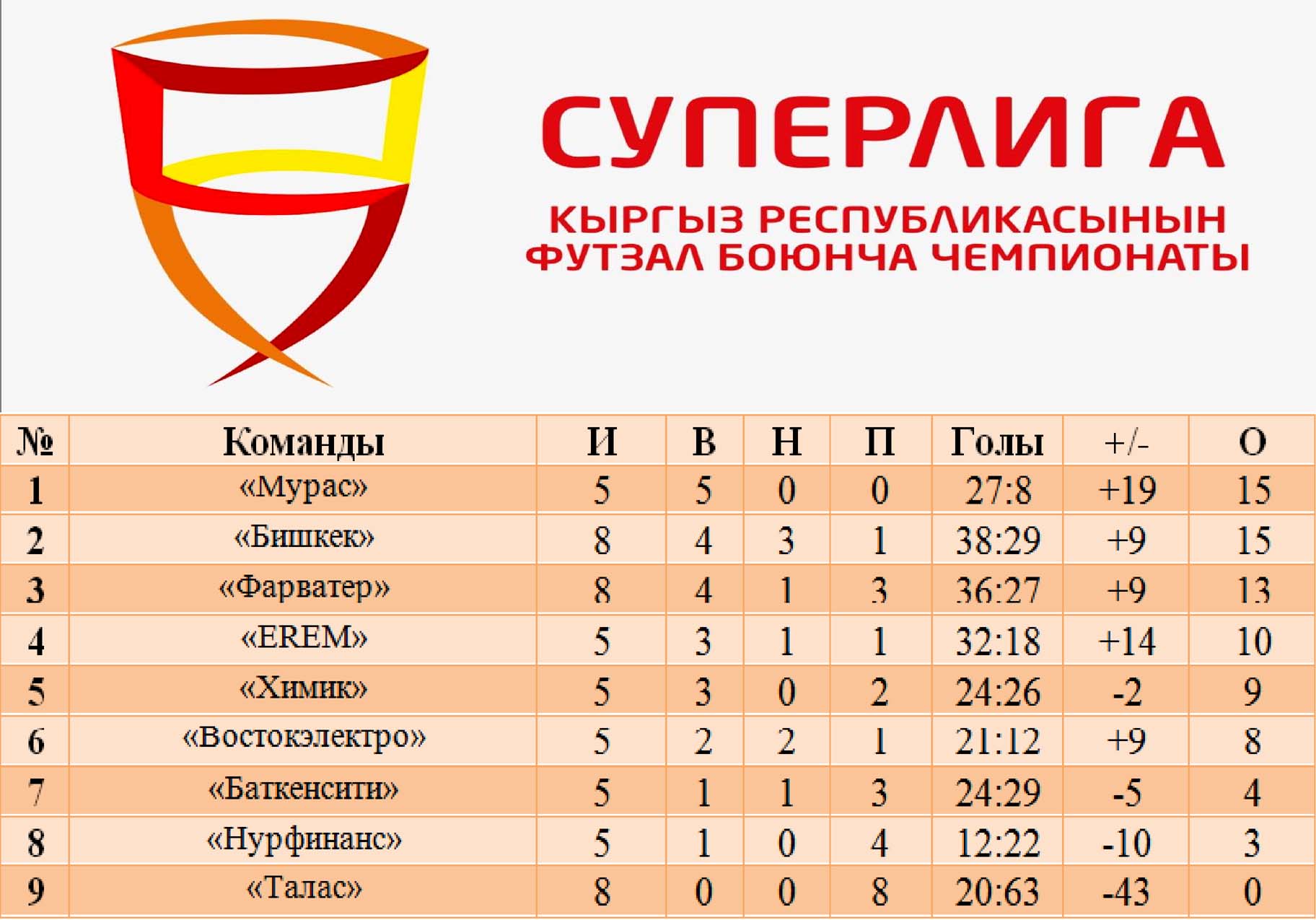 Теперь в турнирной таблице Супелиги по футзалу - два лидера: по 15 очков набрали «Мурас» и «Бишкек». Оданко «Мурас» сыграл» лишь пять матчей, а «Бишкек» - восемь. Замыкает призовую тройку «Фарватер» - 13 очков после восьми матчей.