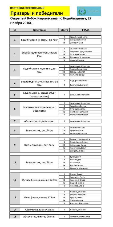 В категории «бодибилдинг» среди юниоров в весе до 75 кг золотую награду завоевал Бектур Расулбеков, второе место у Сергея Ванюшева, а третье - у Руслана Эйбова. В весе свыше 75 кг первым стал Николай Солохин, на втором месте оказался Маратбек уулу Мирбек, на третьем - Артем Путинцев.