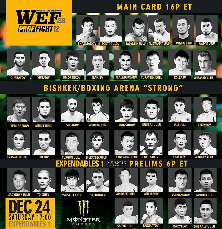 Как отмечается, турнир носит название WEF PROFFIGHT-12 EXPENDABLES-1 (Неудержимые). В этот вечер также состоится матчевая встреча сборной бойцовских клубов Кыргызстана из Москвы против сборной бойцовских клубов Кыргызстана. Соревнования пройдут в центре фитнеса и бокса «Strong». Представляем файткард турнира: