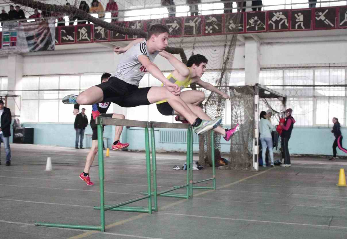 Бег на 60 метров с барьерами - Данил Карин (Кара-Балта, 9,1 секунды) и Карина Легай (СДЮСШОР, 10, 7 секунды).