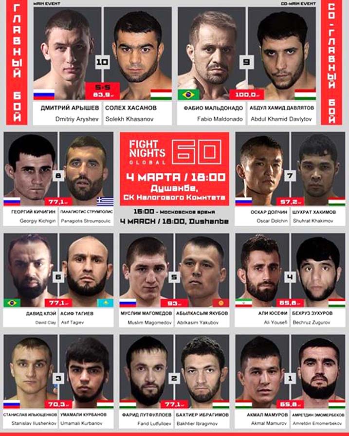 Как отмечается, состязания состоятся 4 марта в Душанбе, в спортивном комплексе Налогового комитета. Кыргызстанцу будет противостоять россиянин Муслим Магомедов. В турнире выступят бойцы, представляющие страны СНГ, а также из стран дальнего зарубежья, в том числе и Бразилии.