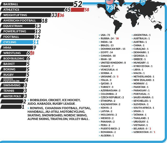 Судя по статистике МРСС, чаще всего на допинге ловили бейсболистов - организация зафиксировала 52 таких случая; на втором месте - легкоатлеты (45); на третьей строчке расположились тяжелоатлеты (33).