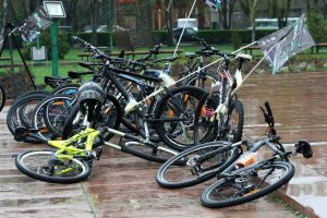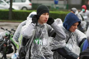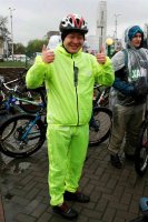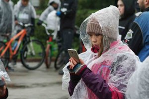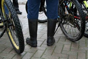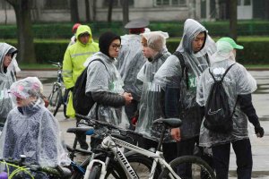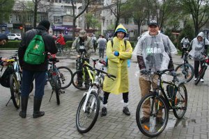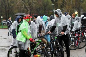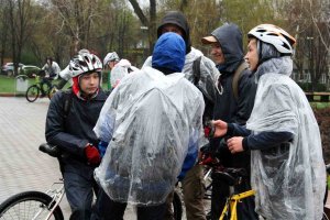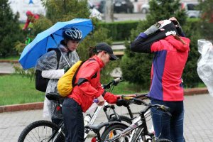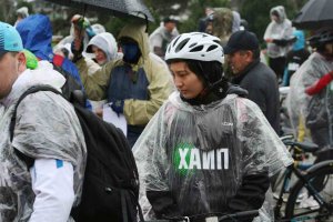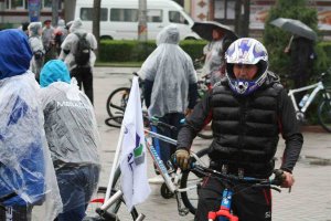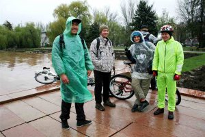 Часть стартующих пряталась от дождя в подземном переходе, а другие в это время готовили велосипеды прямо под дождем, прикрепляя флаги и рекламные лозунги. К слову, сказать, подготовились участники основательно. Кто-то приехал в бахилах, спецодежде и даже в кирзовых сапогах.