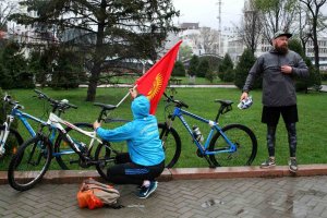 - Сегодня я вышел на старт, несмотря на погоду, так как очень хочу поддержать идею открытия велосезона. Это пропаганда спорта и здорового образа жизни. Катаюсь я относительно недавно, но уже ощутил преимущества передвижения по городу. Разрешите представить вам участника, который прибыл из Канта ранним утром на велосипеде, - сказал велолюбитель Айбек, указывая на стоящего рядом участника.