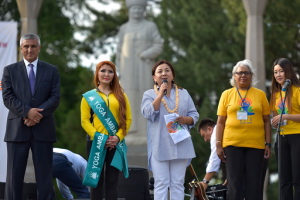 Не осталась в стороне от грандиозного мероприятия вице-мэр города Бишкек Асель Куламбаева, которая призвала всех желающих принять участие в массовом занятии йогой вместе с мастерами Йоги и добавила, что Йога – это философия мировоззрения. Поприветствовала желающих принять участие на этом фестивале и Чрезвычайный и Полномочный Посол Республики Индии в Кыргызстане госпожа Лакшманан Савитри.