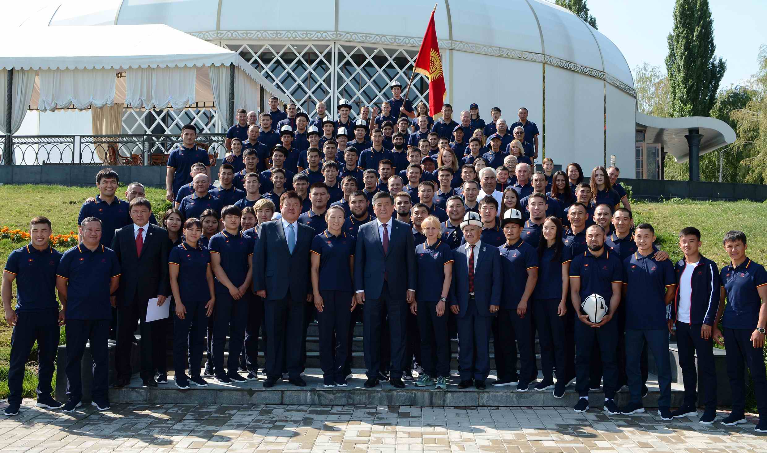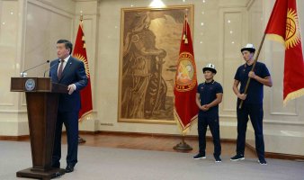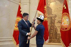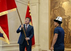 «Мы готовы по достоинству оценить труд каждого из вас. Я держу в руках флаг Кыргызстана, от которого исходит дух нашей Родины, нашего народа и дух родной земли. Держите высоко знамя Кыргызстана - наследие наших предков»,-подчеркнул Президент Сооронбай Жээнбеков и вручил государственный флаг капитану национальных сборных команд спортивной делегации Кыргызской Республики Каныбеку Жолчубекову.