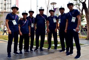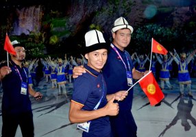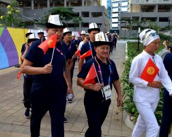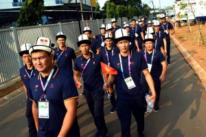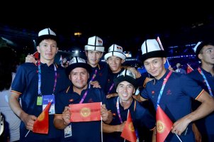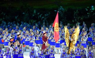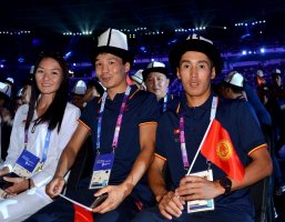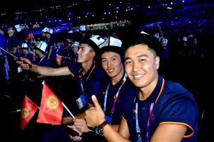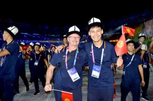 После на арену вышли спортсмены стран-участниц Азиады, которые приняли участие в параде спортивных делегаций. Команда Кыргызстана в числе 45 стран азиатского региона вышла с большим составом, в числе которых также прошел олимпийский чемпион по тяжелой атлетике Каныбек Осмоналиев. Каждую страну сопровождали девушки в костюмах в форме золотой птицы. Замыкал парад стран команда Индонезии в полном составе.