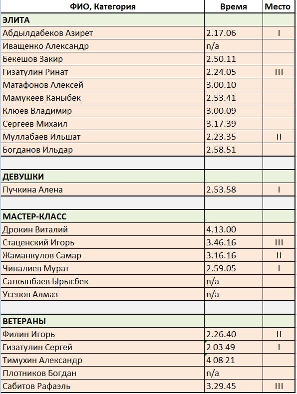Что касается результатов гонки, то в категории «Элита» первым стал Азирет Абдылдабеков, второе место у Ильшата Муллабаева, третьим стал Ринат Гизатулин. Среди девушек победительницей стала Алена Пучкина.