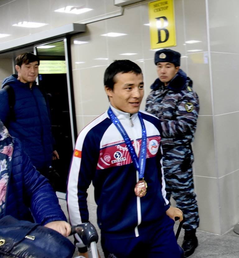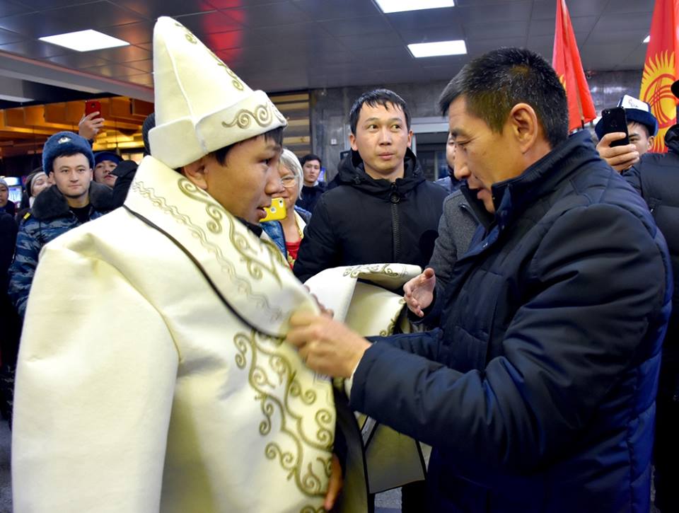 Бронзового призера встречали заместитель директора Государственного агентства по делам молодежи, физической культуры и спорта при Правительстве КР Канатбек Арпачиев, депутат Жогорку Кенеша Кыргызской Республики Максат Эгембердиев, заместитель директора Дирекции по олимпийским видам спорта Эрлан Бекманбетов, родители, родственники, тренера, друзья и болельщики.