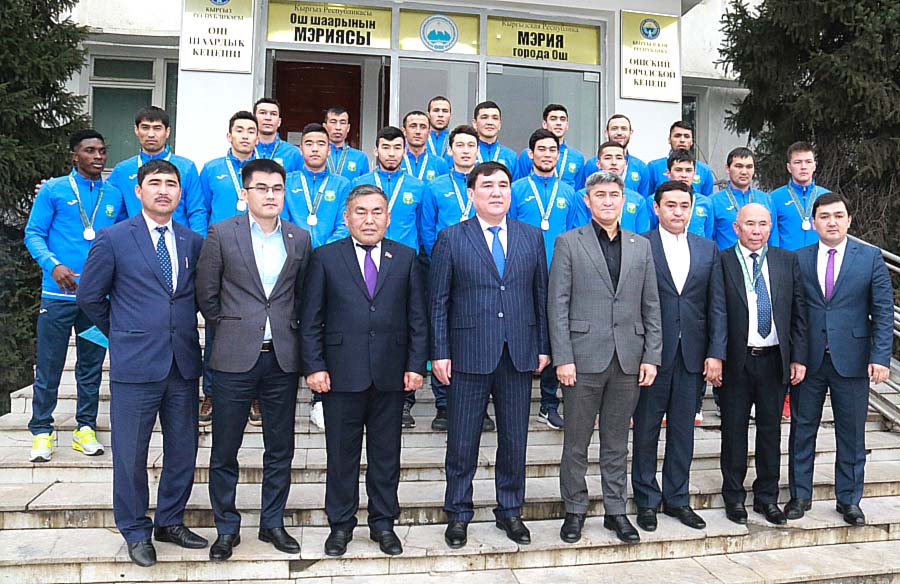 Мэр города Ош поздравил Президента ФФКР Маматова со вступлением в должность. Канатбек Мурзаевич, в свою очередь, подарил именные футболки сборной Кыргызстана мэру и председателю городского Кенеша.