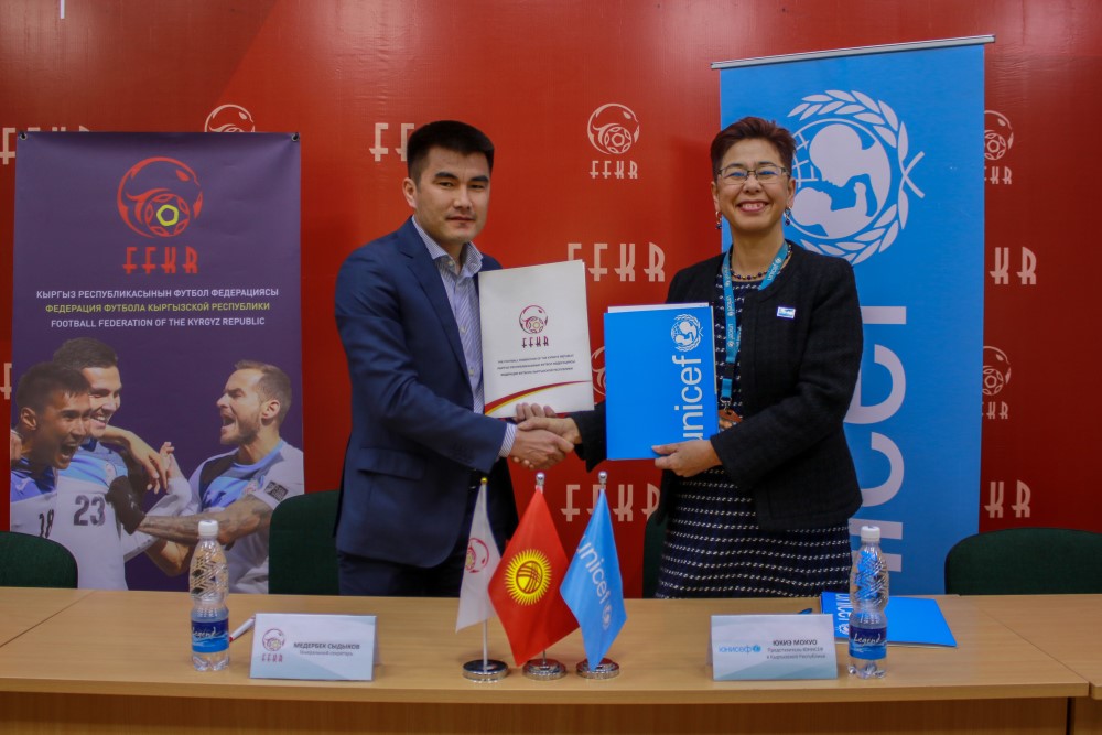 С 2016 года ЮНИСЕФ и ФФКР представили ряд партнерских инициатив, целью которых является информирование о правах детей. Каждый матч Национальной сборной на протяжении более двух лет с командами Филиппин, Ливана, Туркменистана, Макао, Индии и Палестины был посвящен детям с инвалидностью, вопросам важности семейной заботы для каждого ребенка, защите прав девочек и здоровья несовершеннолетних. Кроме того, сотни детей в приграничных районах Баткенской области, а также в Караколе, Оше и Бишкеке приняли участие в инициативах ФФКР и ЮНИСЕФ. Это подписание очередной этап в сотрудничестве двух организаций во благо подрастающего поколения.