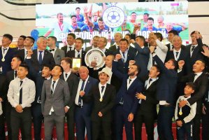 Далее состоялась церемония награждения команды «Дордой». Игрокам была вручена «Чемпионская тарелка» - с нынешнего сезона главный футбольный трофей страны. Это трофей, составленный из сплава цветных металлов, никеля, цветной эмали, ювелирных вставок и чемпионской гравировки.