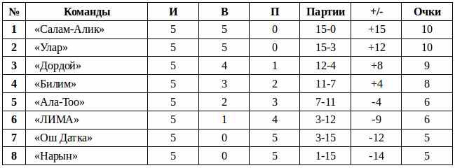 В первом туре команды провели по пять игр. Во всех из них победили «Салам-Алик» и «Улар», они являются лидерами в турнирной таблице - по 10 очков. Очередной тур состоится в марте.
