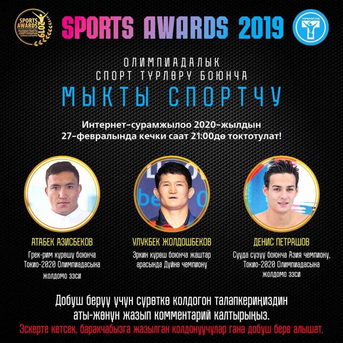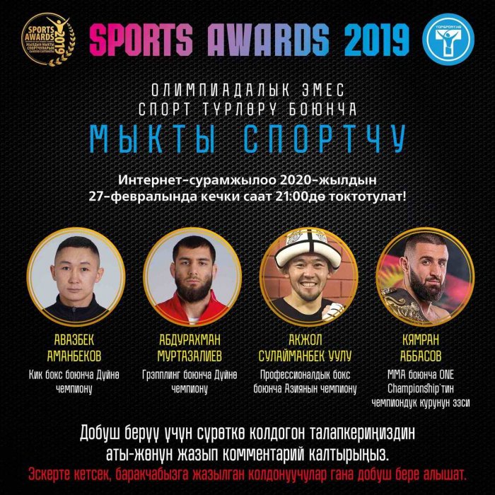 Как сообщают организаторы, премия присуждается спортсменам Кыргызстана за выдающиеся достижения в профессиональной деятельности в области спорта и физической культуры, а также людям, внесшим значительный вклад в развитие и пропаганду спорта. Мероприятие в этом году проводится в шестой раз.