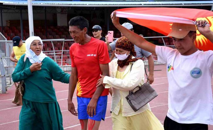 На стадионе Оболбека Осмонбекова встретили заместитель директора Государственного агентства по делам молодежи, физической культуры и спорта Канатбек Арпачиев, родственники и друзья ультрамарафонца.