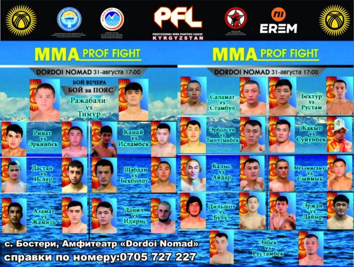 31 августа в культурно развлекательном комплексе «Dordoi Nomad» села Бостери Иссык-Кульской области Кыргызстана пройдет турнир по смешанным боевым единоборствам (ММА), посвященный празднованию Дня Независимости Кыргызской Республики.