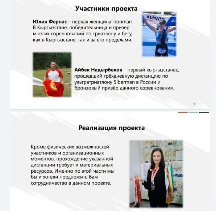 Известные спортсмены Юлия Фернас и Айбек Надырбеков планируют пройти семь полных Ironman семь дней подряд в семи областях Кыргызстана. Накануне известные триатлеты обратились к сообществу.