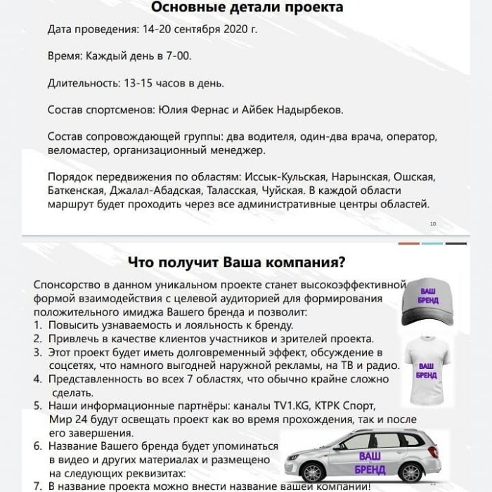 - Нам необходима финансовая поддержка! - говорится в сообщении. - Общий бюджет проекта составляет 470 тысяч сомов. Эта сумма комфортного прохождения. Нереализованные средства будут возвращены спонсорам. Но существует риск не собрать данную сумму. И тогда при вычетах всех запасов остается сумма в 280 тысяч сомов. Время сборов денег заканчивается до 23:59 вторника. После этого момента физически невозможно будет полноценно подготовиться к отъезду. Поэтому держим кулачки, чтобы спонсоры нашлись! - сообщила участник проекта Юлия Фернас.