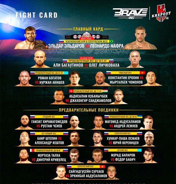 В главном бою вечера чемпион мира в суперлегком весе Эльдар Эльдаров сразится с бразильским нокаутером Леонардо Мафрой. Также на турнире будут драться известные российские и мировые звезды ММА, среди которых Али Багаутинов, Роман Богатов, Константин Ерохин.