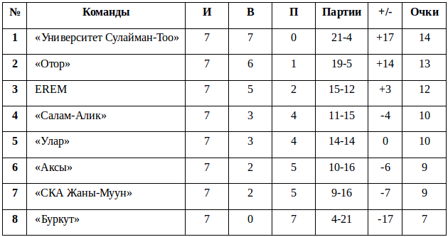 Как сообщает Федерация волейбола КР, в Национальной Лиге участвовали 8 команд, которые сыграли между собой в один круг - каждый с каждым.