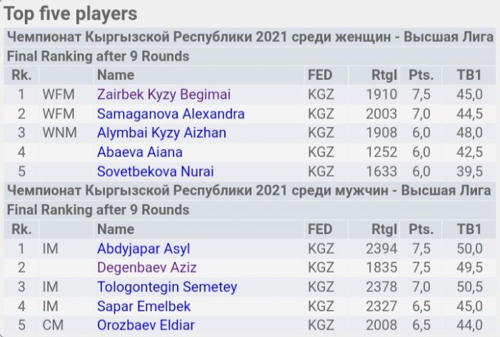 Напомним, что в мужском (открытом) чемпионате принимают участие 62 игрока, в женском - 23 игрока. Главный судья турнира - международный арбитр Азиз Умарбеков. Призовой фонд в Высшей Лиге - Кубок «М Булак» - 250 000 сомов.