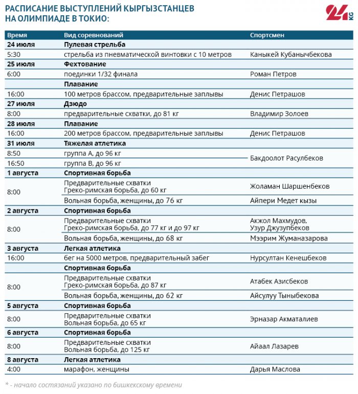 Предварительное расписание соревнований с участием кыргызстанских спортсменов в рамках XXXII Олимпийских игр составлено ИА 24.kg.