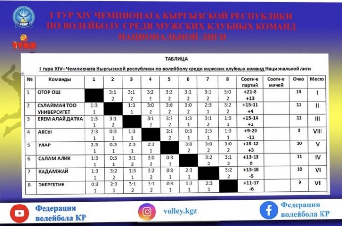 Накануне в Бишкеке завершился первый тур чемпионата Кыргызстана по волейболу среди команд Национальной Лиги. Об этом сообщает федерация этого вида спорта КР.