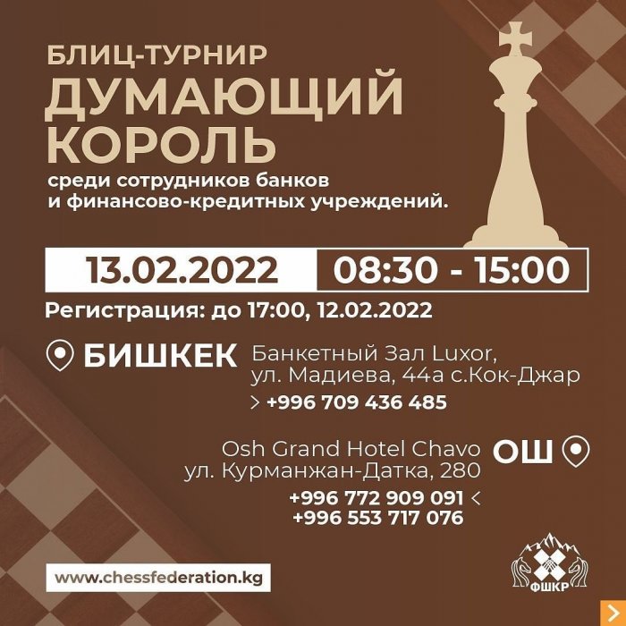 С 12 по 20 февраля в Бишкеке и Оше пройдет серия шахматных турниров. Об этом сообщает Федерация шахмат Кыргызстана.