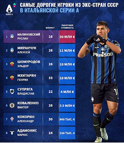 Самым дорогим стал украинский футболист «Аталанты» 28-летний Руслан Малиновский, его стоимость составляет 30 миллионов евро.