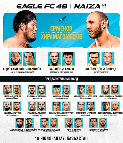 - Даурен Ермеков (Казахстан, 15-5-0) - Гамзат Хирамагомедов (Россия, 10-2-0), бой за временный титул чемпиона EagleFCв среднем весе;