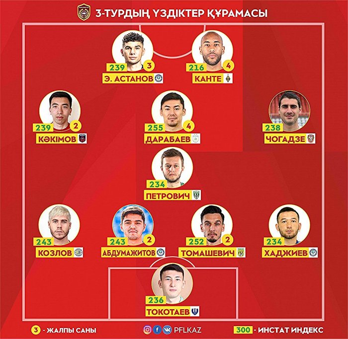 - Нападающие: Эльхан Астанов («Ордабасы»), Хосе Канте («Кайрат»).