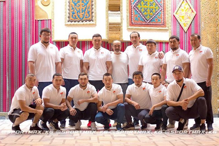 Канат Шабданбаев передал флаг капитану сборной, борцу греко-римского стиля Атабеку Азизбекову.