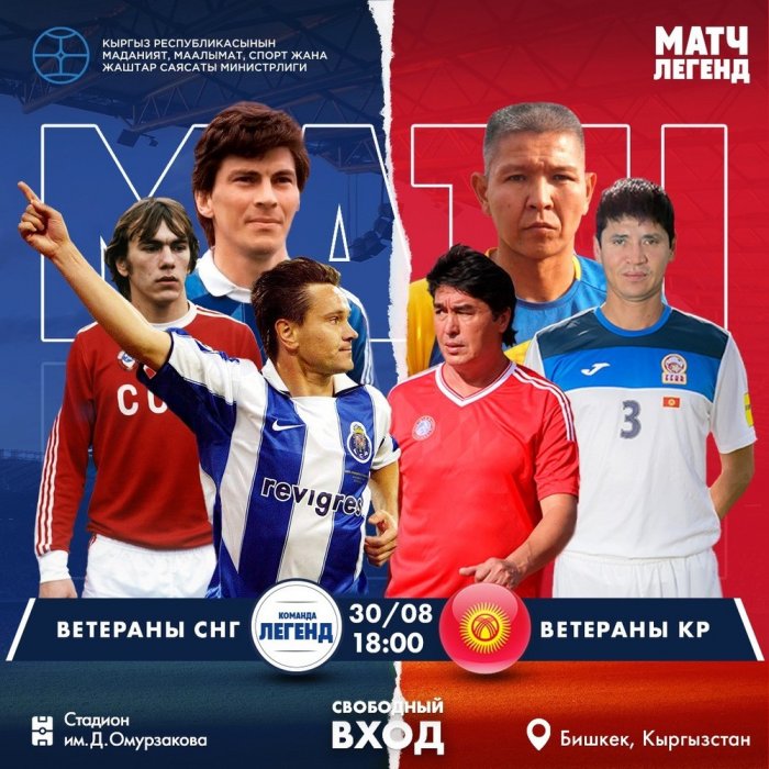 30 августа в Бишкеке пройдет футбольный матч между сборной ветеранов кыргызского футбола и сборной ветеранов стран СНГ. Организаторы - Министерство культуры, спорта и молодежной политики КР.