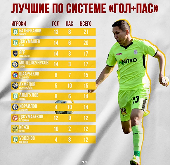 На втором месте расположился одноклубник Батырканова - Атай Джумашев - 20 (14+6), а на третьем - Эммануэль Ягр («Алай») и Элдар Молдожунусов («Нефтчи») - по 17 (14+3).