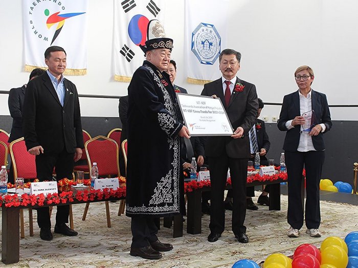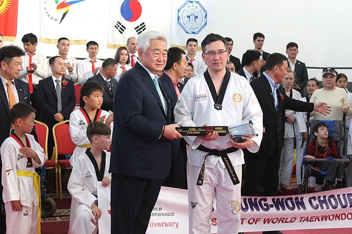 За вклад в развитие таэквондо в КР Доктор Чунг Вонг Чой вручил «Почетный черный пояс» (4-й дан) президенту общественного объединения корейцев Кыргызстана Вячеславу Николаевичу Хан.