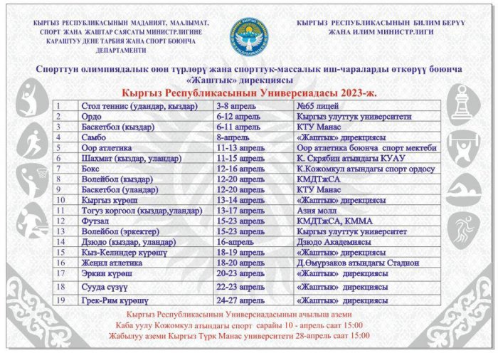 Церемония открытия Универсиады начнется 10 апреля в 15:00 во Дворце спорта им Каба уулу Кожомкула в Бишкеке.