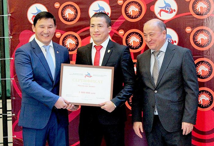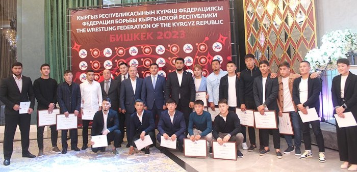 В рамках церемонии Федерация борьбы Кыргызской Республики вручила денежные премии победителям и призерам чемпионатов Азии и мира среди U-15, U-17,U-20,U-23 и взрослых - главным, старшим и личным