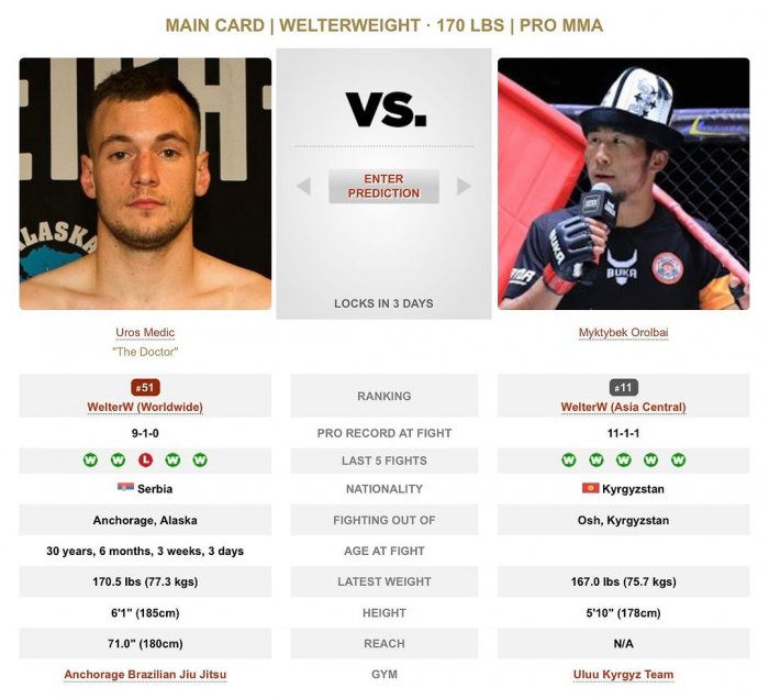 Также сообщается, что Мыктыбек Оролбай уулу (11-1-1) уже 19 ноября утром в Лас-Вегасе (США) на турнире UFC Fight Night 232 (Vegas 82) сразится с Урошем Медичем (9-1 MMA, 3-1 UFC) из Сербии, в весе до 77 кг.