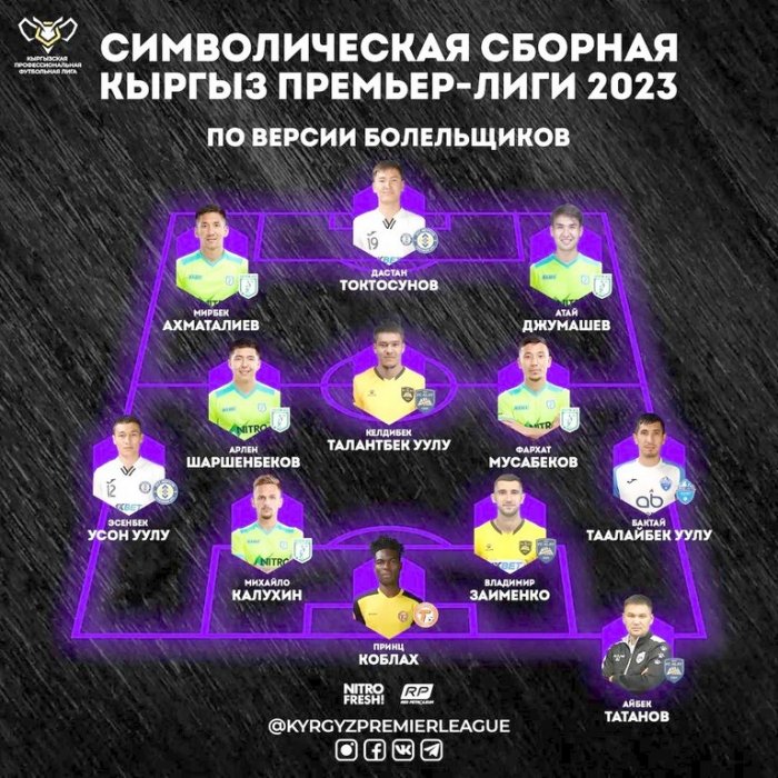 Кыргызская профессиональная футбольная Лига опубликовала в соцсетях символическую сборную Кыргызской Премьер-Лиги-2023 по футболу по версии болельщиков.